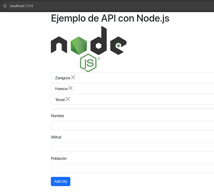 <!DOCTYPE html> <html> <head> <title>Ejemplo 1: API con Node.js</title> <link href="https://cdn.jsdelivr.net/npm/bootstrap@5.3.3/dist/css/bootstrap.min.css" rel="stylesheet" crossorigin="anonymous"> <script type="module" src="index.js"></script> </head> <body onload="readCities()"> <div class="container"> <h1>Ejemplo de API con Node.js</h1> <img src="nodejs.png"/> <ul id="cities" class="list-group"> </ul> <hr/> <form> <div class="mb-3"> <label for="name" class="form-label">Nombre</label> <input class="form-control" type="text" id="name"/> </div> <div class="mb-3"> <label for="altitude" class="form-label">Altitud</label> <input class="form-control" type="text" id="altitude"/> </div> <div class="mb-3"> <label for="population" class="form-label">Población</label> <input class="form-control" type="text" id="population"/> </div> <button type="button" class="btn btn-primary" onClick="addCity()">Add city</button> </form> </div> </body> </html>