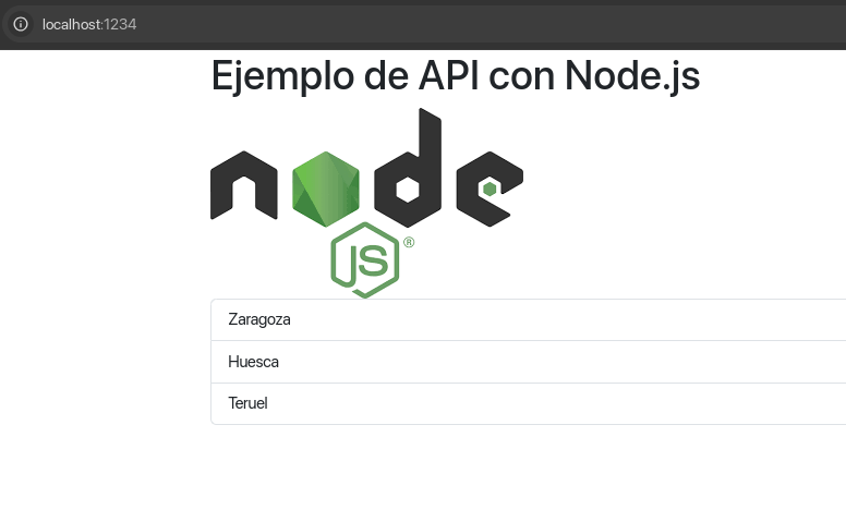 <!DOCTYPE html> <html> <head> <title>Ejemplo 1: API con Node.js</title> <link href="https://cdn.jsdelivr.net/npm/bootstrap@5.3.3/dist/css/bootstrap.min.css" rel="stylesheet" crossorigin="anonymous"> <script type="module" src="index.js"></script> </head> <body onload="readCities()"> <div class="container"> <h1>Ejemplo de API con Node.js</h1> <img src="nodejs.png"/> <ul id="cities" class="list-group"> </ul> </div> </body> </html>