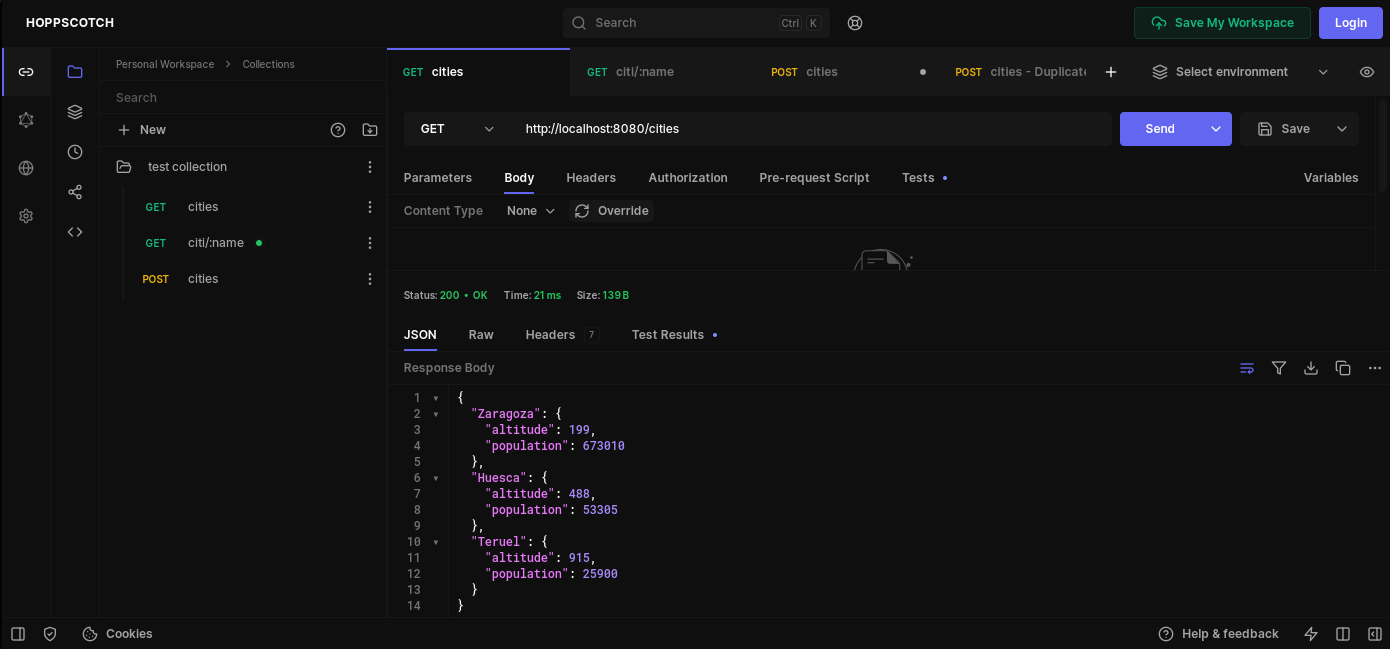 - cities_collection.json: Colección de requests para usar con Hoppscotch y cualquiera de los proyectos cities-backend