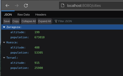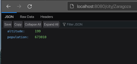 - http://localhost:8080/city/Zaragoza: Para ver los datos de una ciudad concreta (en este caso Zaragoza pero podríamos indicar cualquiera de las existentes)