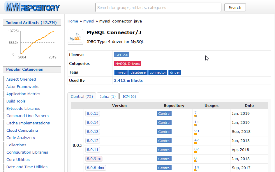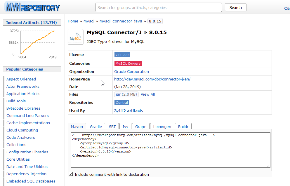 <dependency> <groupId>mysql</groupId> <artifactId>mysql-connector-java</artifactId> <version>8.0.13</version> </dependency>