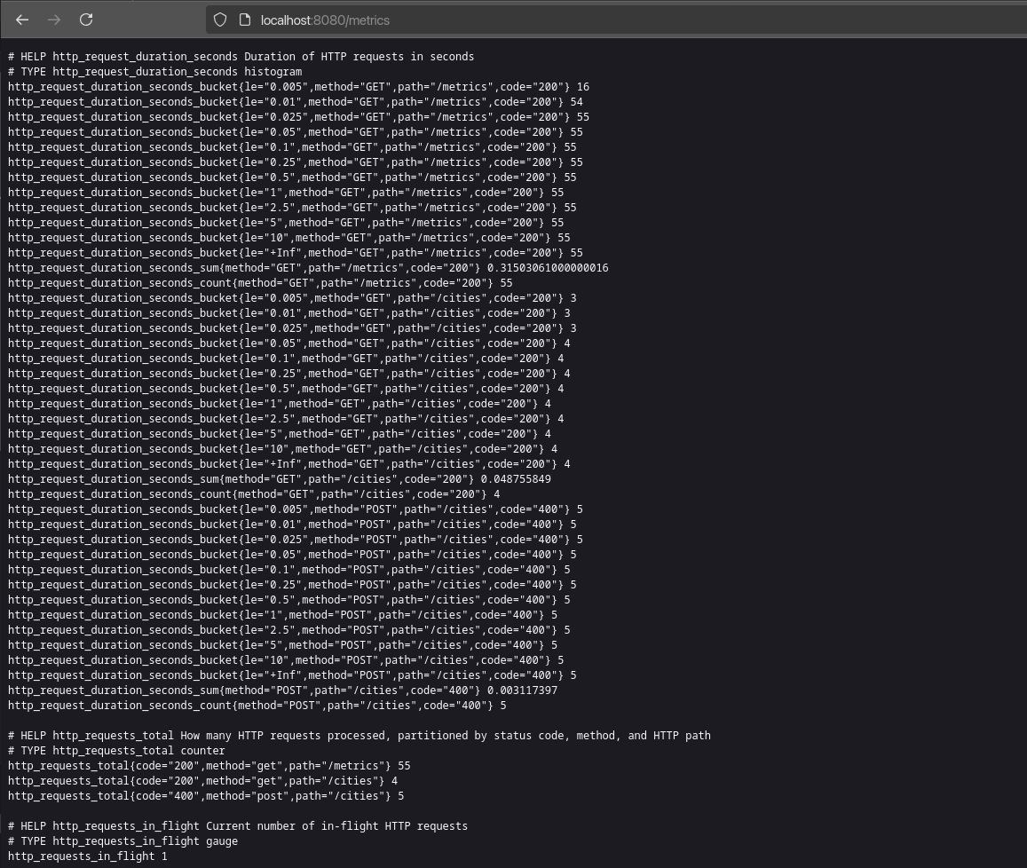 En http://localhost:8080/metrics ya podremos visualizar las métricas (como texto plano)