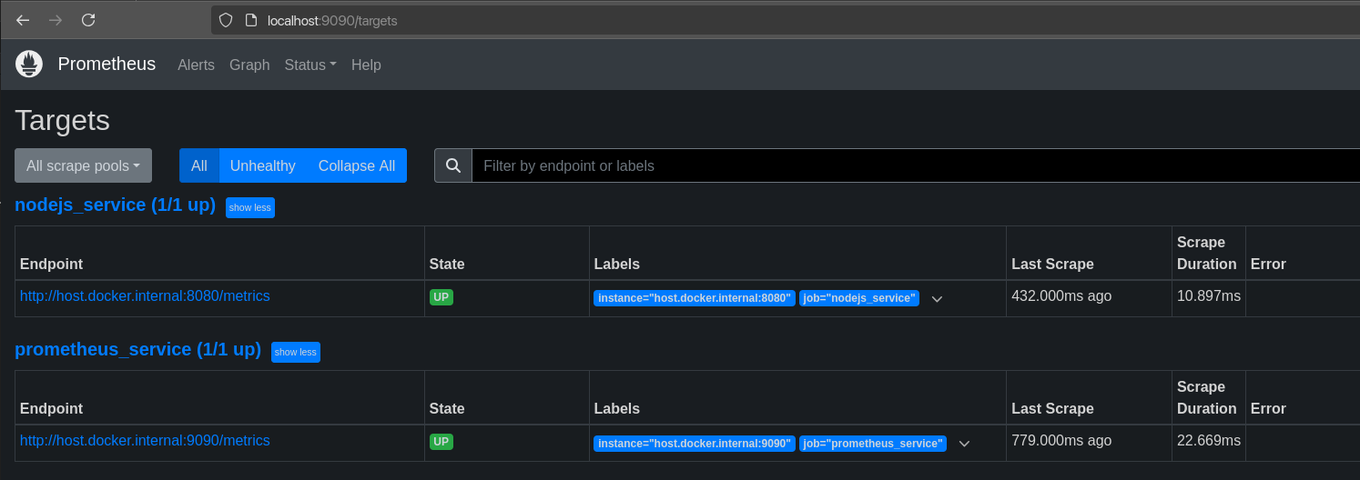 global: scrape_interval: 5s scrape_configs: - job_name: "prometheus_service" static_configs: - targets: ["host.docker.internal:9090"] - job_name: "nodejs_service" static_configs: - targets: ["host.docker.internal:8080"]